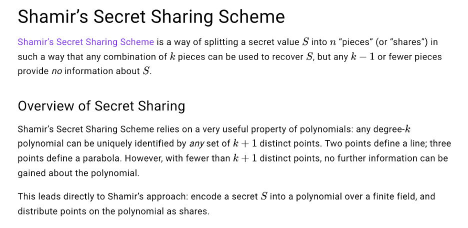 Secret sharing is a cryptographic protocol for splitting a secret key (or other secret data) into key shares. These key shares should look entirely random so that, on their own, they reveal no information about the underlying secret. Still, when enough shares are combined, the original secret can be recovered. The most common technique for secret sharing is Shamir’s Secret Sharing scheme, which leverages properties of polynomials.