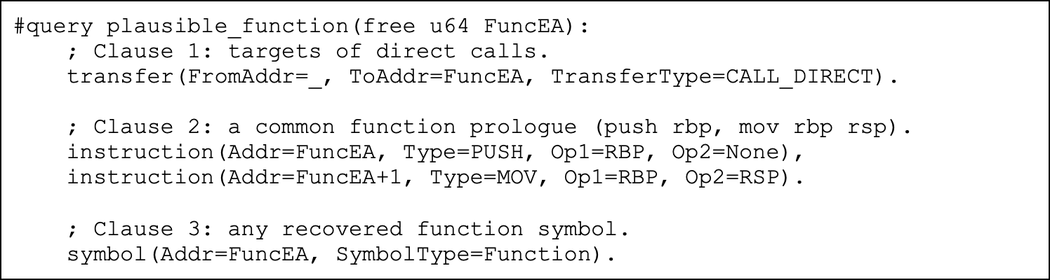 Listing 1: This query retrieves the set of all plausible function entry points. Here, “free” denotes that the query must find all candidates that match the subsequent clauses. In a bounded clause (e.g., given some fixed address), the tag “bound” is used instead (see listing 5).