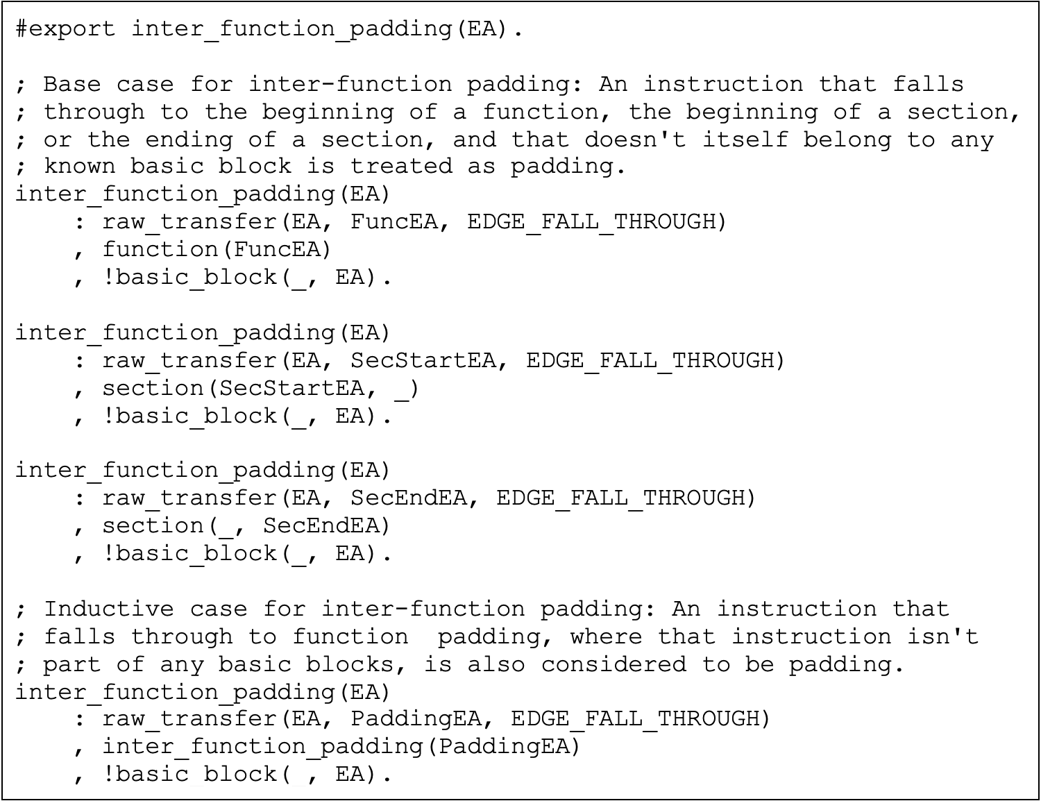 Listing 1: This query retrieves the set of all plausible function entry points. Here, “free” denotes that the query must find all candidates that match the subsequent clauses. In a bounded clause (e.g., given some fixed address), the tag “bound” is used instead (see listing 5).