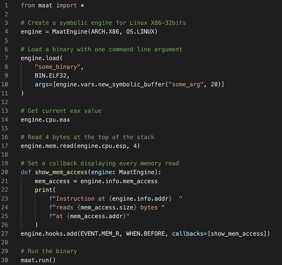 While our Manticore tool offers a high-level interface to symbolically explore binaries, Maat is a lower-level symbolic execution toolkit that can be easily integrated into other projects or used to build stand-alone analysis tools. For a straight-to-the-point example, read our tutorial on how to solve a basic reverse engineering challenge with Maat.