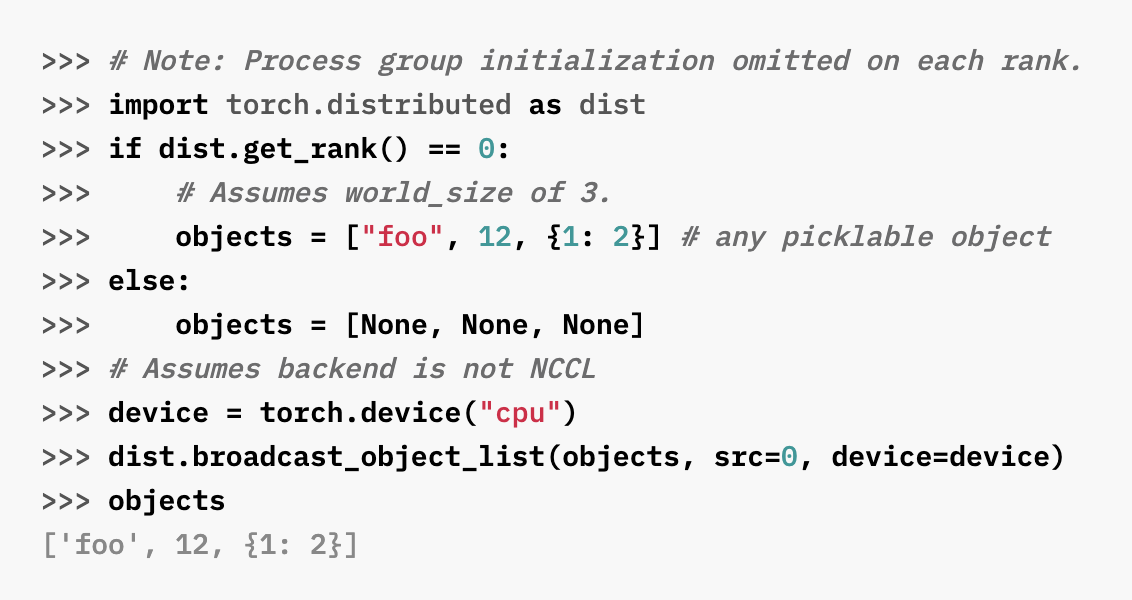 PyTorch Distributed provides users with broadcast_object_list, a function that shares a list of objects to other nodes in a group. Its usage is demonstrated in the following code snippet obtained from the PyTorch Distributed documentation: