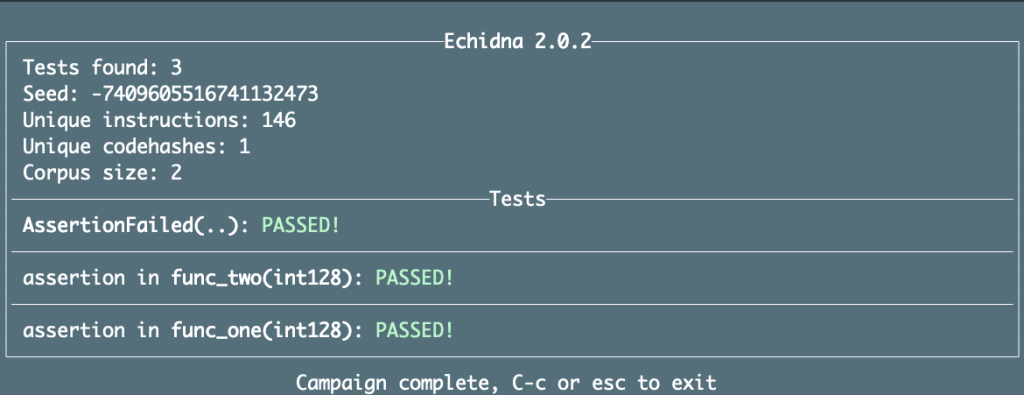 Upon running Hybrid Echidna, we are greeted with another friendly UI that provides insight into its performance. This includes timing information and the following key takeaways: