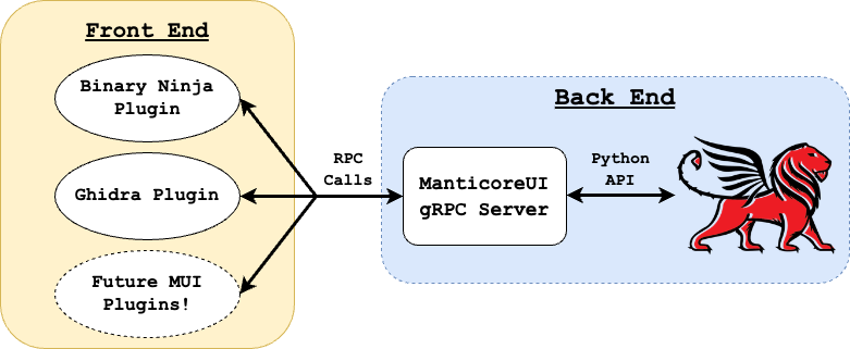 The server is written in Python, providing it access to the full functionality of Manticore’s Python API, but is bundled into a shiv binary that can be called in any language. This facilitates a new client-server architecture that allows developers to implement any back-end Manticore functionality and tests just once. Developers of the front-end disassembler plugins can make RPC requests to the server with just a few lines of trivial code, which means that their work on individual plugins can focus almost entirely on front-end/UI changes.