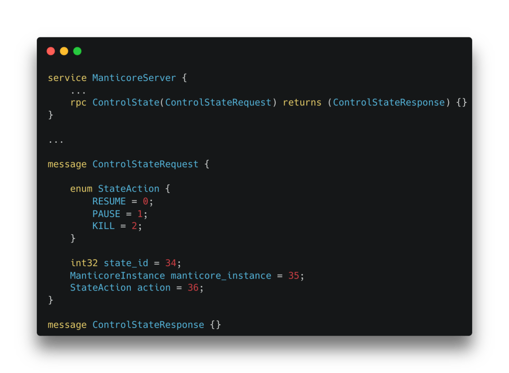 avoidhook or becomes stuck in an infinite loop, we will be able to abandon it.First, we will define a new RPC and the RPC’s message formats in our protocol buffer file. The server will receive the state’s numeric ID, the Manticore instance that we’re working with, and aStateActionenum indicating whether it should resume, pause, or kill the state.