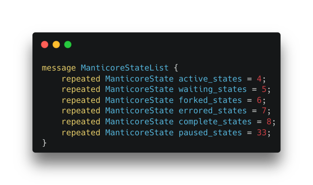 We’ll also need to update an existing message—ManticoreStateList. MUI plugins have state lists that display all states and the status of each state; these lists are updated via a GetStateList RPC. Because it’d be beneficial for users to see “paused” states as distinct from preexisting state statuses, we’ll add a new paused_states field to the RPC’s response message, which will contain a list of the states paused by the user.