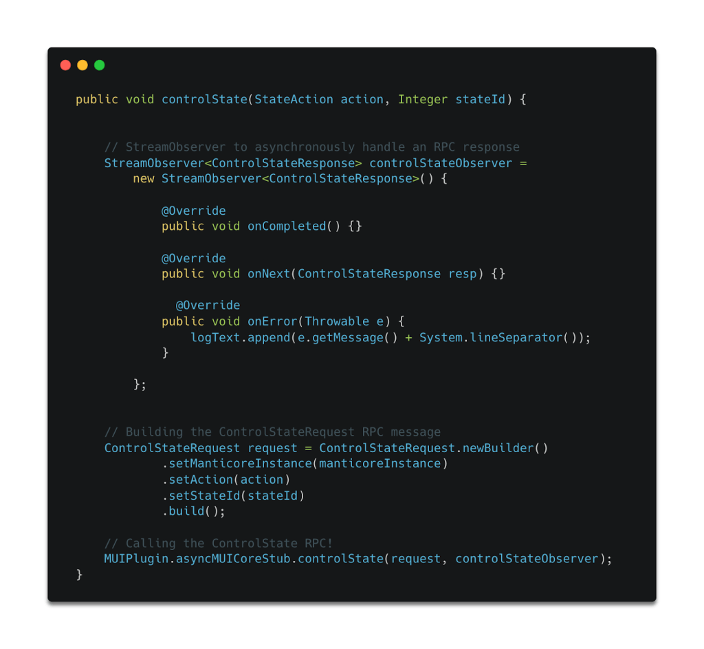 Then, we have to write the function that actually executes the RPC. In our plugins, we encapsulate all such “connector” functions in a single file. In the Ghidra plugin, writing a connector function involves only three steps. First, we create a StreamObserver object to asynchronously handle RPC responses. In this case, we need only implement behavior for handling error cases, since the “results” of successful ControlState RPCs will be available to the user via the GetStateList RPC. Then we build the ControlStateRequest object, populating the fields as required. Lastly, we actually execute the RPC through a method exposed by the gRPC-generated ManticoreServerStub, which conveniently handles all communication with the server for us.