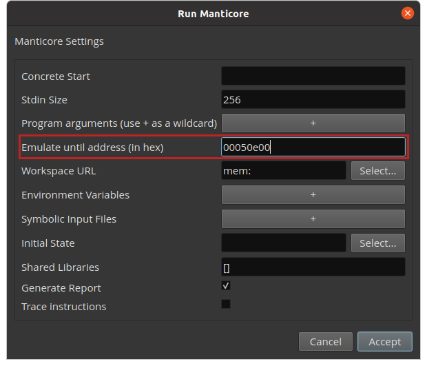 The emulate_until feature is an additional MUI solve option. Setting this value to an address will make Manticore use the Unicorn emulator to concretely emulate your target binary until it reaches the address specified. The Unicorn emulator is far faster than Manticore’s own emulated CPU, which greatly improves execution speed.