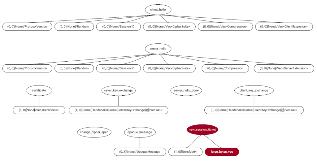Visualized exploit for DOSC (CVE-2022-38153). Each box represents a TLS message. Each message is composed of different fields like a protocol version or a vector of cipher suites. The visualization was generated using the tlspuffin fuzzer and mirrors the structure of the DY attacker traces which will be introduced in the next section.