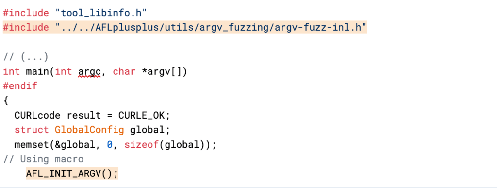 AFL_INIT_ARGV()macro initializes theargvarray with the arguments passed to the program from the command line. It then reads the arguments from standard input and puts them in theargvarray. The array is terminated by twoNULLcharacters, and any empty parameter is encoded as a lone0x02character. - The