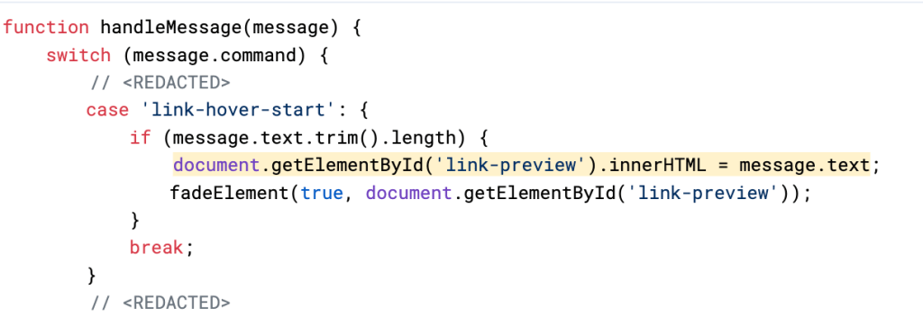 We don’t have to look hard! The link-hover-start handler is vulnerable to HTML injection because it directly passes input from the iframe message (which we control the contents of) to the innerHTML attribute of an element of the Webview without any sanitization. This allows an attacker to control part of the Webview’s HTML.