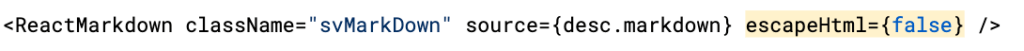 While examining the code where the SARIF data is rendered, I came across a suspicious-looking snippet in which the description of a static analysis result is rendered using the ReactMarkdown class with the escapeHtml option set to false.