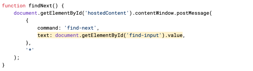 My goal was to somehow make the Webview attach the nonce to a “fake” find-input element that we would inject using our HTML injection. I dreamed of injecting an incomplete element like <input id="find-input" value=" : This would create a “fake” element with the find-input ID, and open its value attribute without closing it. However, this was doomed to fail for multiple reasons. First, we cannot escape from the element we are setting the innerHTML to, and since we are writing it in full, it could never contain the nonce. Second, the DOM parser does not parse the HTML in the example above; our element is just left empty. Finally, the document.getElementById('find-input') always finds the already existing element, not the one we injected.
