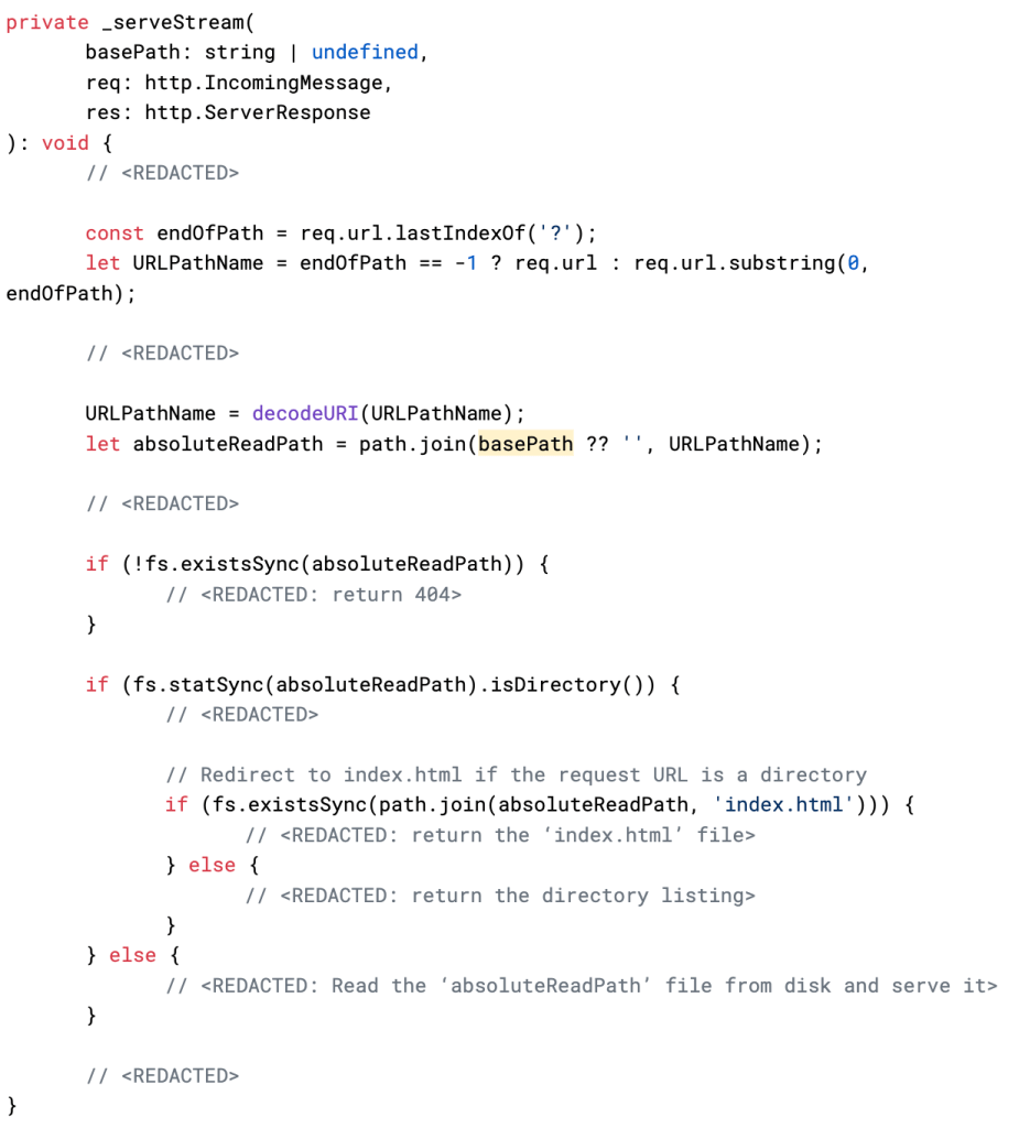 Since we couldn’t get around the CSP, I thought another interesting place to investigate was the local HTTP server that serves the HTML files to be previewed. Could we fetch arbitrary files from it or could we only fetch files in the current workspace?