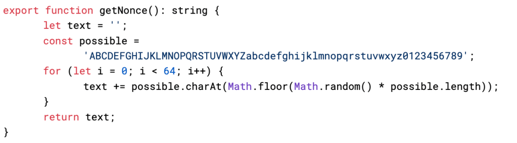 An astute reader might have noticed that the nonce-generating function uses Math.random, a cryptographically unsafe random number generator. Math.random uses the xorshift128+ algorithm behind the scenes, and, given X random numbers, we can recover the algorithm’s internal state and predict past and future random numbers. See, for example, the Practical Exploitation of Math.random on V8 conference talk, and an implementation of the state recovery.