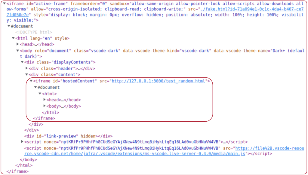 At this point, I was at a dead end; the CSP effectively prevented the full exploit. But I wanted more! In the next vulnerability, we’ll look at another bug that I used to fully exploit the Live Preview extension without injecting any JavaScript in the Webview.