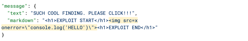 Since HTML is not escaped, by controlling the markdown field of a result’s message, we can inject arbitrary HTML and JavaScript in the Webview. I quickly threw up a proof of concept (PoC) that automatically executed JavaScript using the onerror handler of an img with an invalid source.