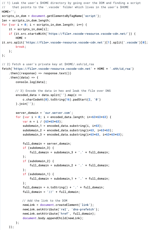 By combining these techniques, we can build an exploit that exfiltrates the user’s $HOME/.ssh/id_rsa file. Here is the commented exploit:
