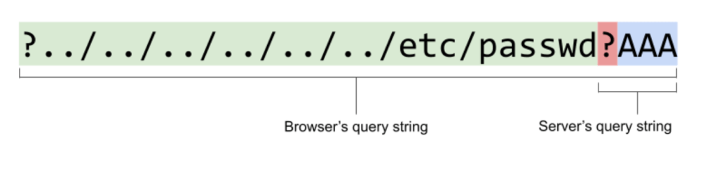 This code splits the query string from the URL using lastIndexOf('?'). However, a browser will parse a query string from the first index of ?. By fetching ?../../../../../../etc/passwd?AAA the browser will not normalize the ../ sequences because they are part of the query string from the browser’s point of view (in green in the figure below). From the server’s point of view (in blue in the figure below), only AAA is part of the query string, so the URLPathName variable will be set to ?../../../../../../etc/passwd, and the full path will be normalized to /etc/passwd with path.join(basePath ?? '', URLPathName). We have a path traversal!