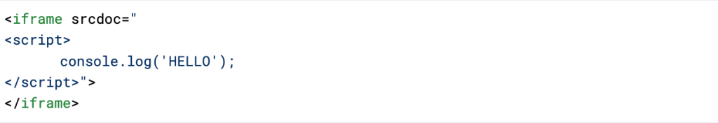 <script> console.log('HELLO'); </script> does not work because the script is added to the DOM but does not get loaded. Thankfully, there’s a neat trick we can use to circumvent this limitation: writing the script inside an srcdoc iframe, as shown in the figure below.