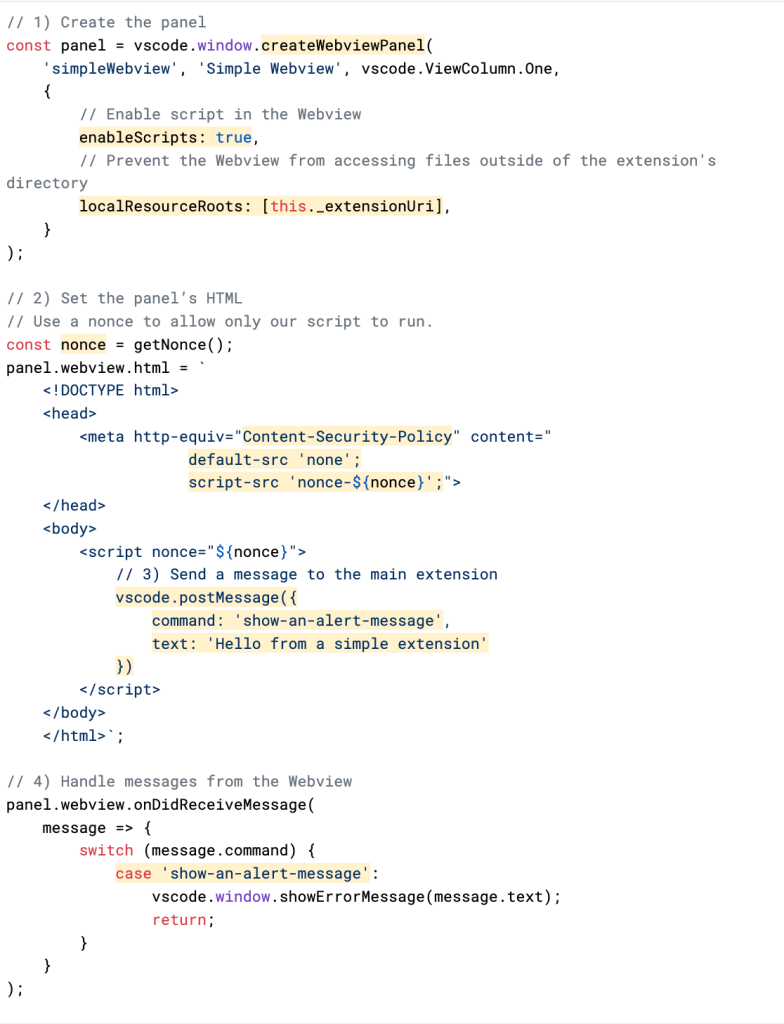 enableScripts: prevents the Webview from executing JavaScript if set tofalse. Most extensions requireenableScripts: true.localResourceRoots: prevents Webviews from accessing files outside of the directories specified inlocalResourceRoots. The default is the current workspace directory and the extension’s folder.Content-Security-Policy: mitigates the impact of XSS vulnerabilities by limiting the sources from which the Webview can load content (images, CSS, scripts, etc.). The policy is added through a meta tag of the Webview’s HTML source, such as:<meta http-equiv="Content-Security-Policy" content="default-src 'none';">