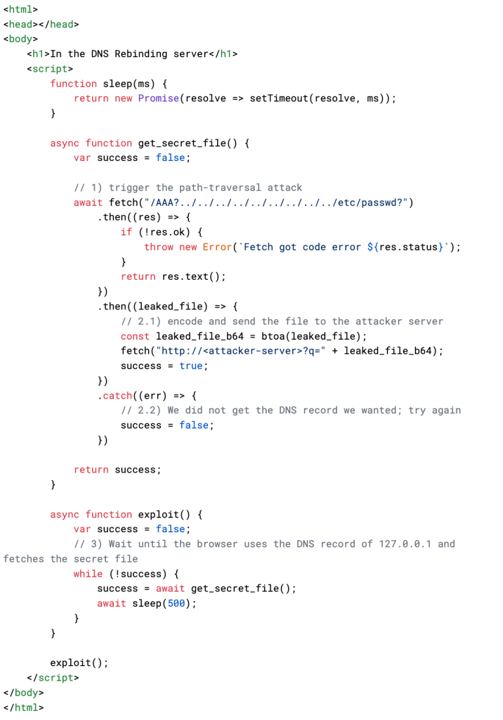 To steal a victim’s local files, we need to make them browse to the 7f000001.c0a80d80.rbndr.us URL, hoping that it will resolve to our server with the exploit. Then, our exploit page makes fetches with the path traversal attack on a loop until the browser makes a DNS request that resolves to the 127.0.0.1 IP; once it does so, we get the content of the sensitive file. Here is the commented exploit: