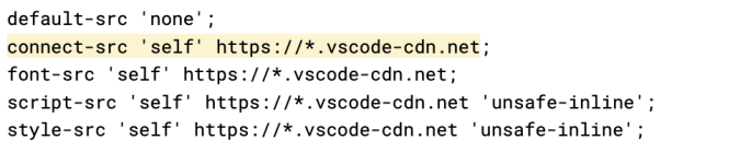 However, the Webview has a fairly restrictive CSP. In particular, the connect-src directive restricts fetches to self and https://*.vscode-cdn.net. Since we don’t control either source, we cannot make fetches to our attacker-controlled server.