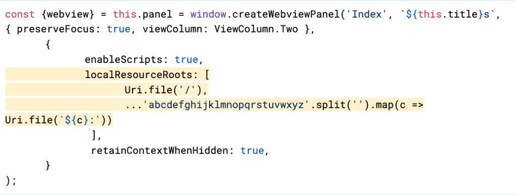 As we can see, localResourceRoots is configured very poorly. It allows the Webview to read files from anywhere on the disk, up to the z: drive! This means that we can just read any file we want—for example, a user’s private key at ~/.ssh/id_rsa.
