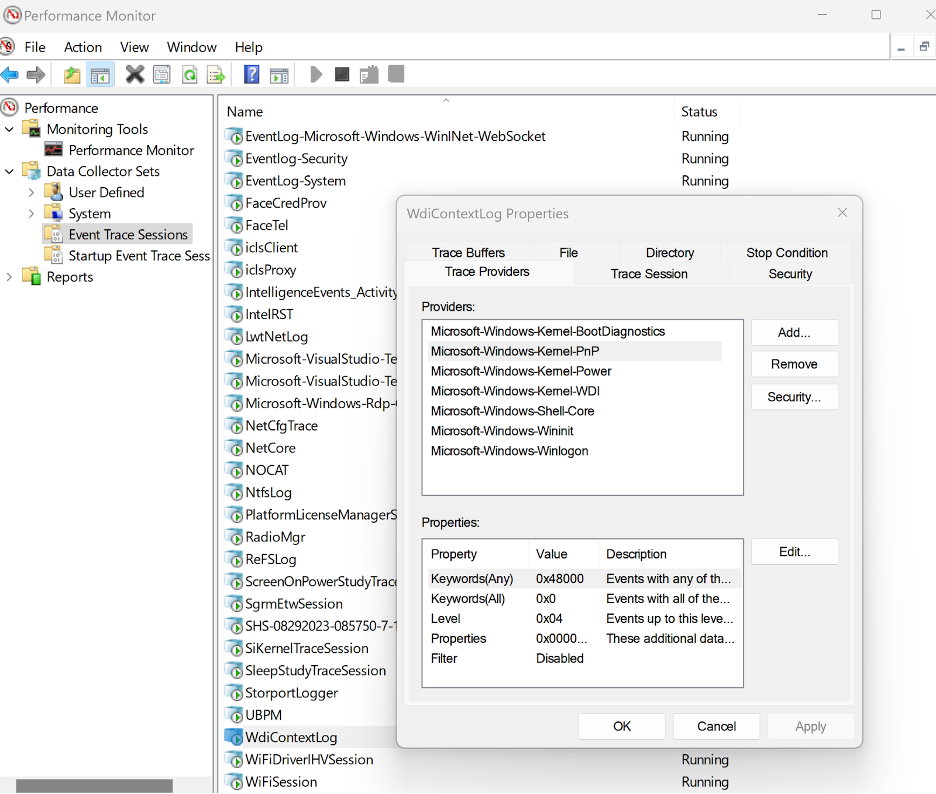 Finding the consumers of an ETW log session is only half the battle—we also want to know which providers notify each log session. We saw earlier that we can get that information from Performance Monitor, but let’s see how we can also get it from a debugger session, as it might be useful when the live machine isn’t available or when looking for details that aren’t supplied by user-mode tools like Performance Monitor.