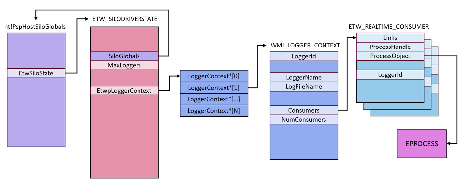 In fact, by using the logger array, we can build a better way to enumerate ETW log session consumers. Each logger context has a Consumers field, which is a linked list connecting all of the ETW_REALTIME_CONSUMER structures that are subscribed to this log session:
