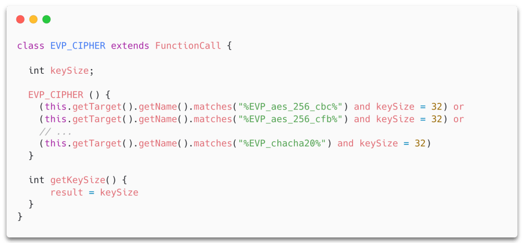 Now, we need to identify what the size of the key should be. This clearly depends on which cipher that is used. However, CodeQL doesn’t know what a cipher is. In OpenSSL, each cipher exposed by the high-level EVP API is an instance of the type EVP_CIPHER, and each cipher is initialized using a particular function from the API. For example, if we want to use AES-256 in CBC-mode, we pass an instance of EVP_CIPHER returned from EVP_aes_256_cbc() to EVP_EncryptInit_ex. Since the API name contains the name of the cipher, we can use the getName() and matches() predicates in CodeQL to compare the names of function calls to patterns in the names of the ciphers.