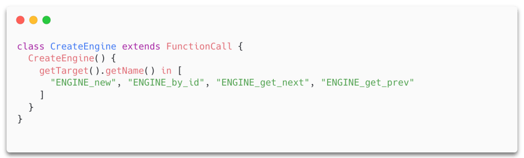 After reading the documentation on the OpenSSL engine API, it seems that the API user can create an engine object in a few different ways. We decided to write a CodeQL class that simultaneously captured the four different functions a user could use to load a new engine. (These functions either create a new unselected instance, create a new instance selected by ID, or select an engine from a list using “previous” and “next” style function names.)