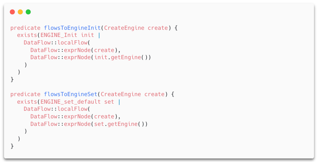 Now that we have defined the functions used to initialize a new engine using CodeQL, we need to define what the corresponding data flow should look like. We want to make sure that data flows from CreateEngine to ENGINE_init and ENGINE_set_default.