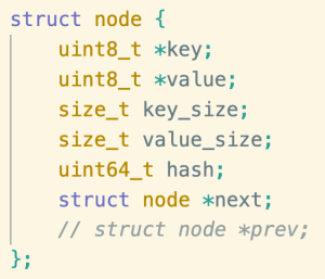The structure for linked list nodes (figure 4) is particularly relevant to this example. The structure has buffers for the key and value stored in the node, along with sizes for each buffer. Additionally, each node has a next pointer that is either null or points to the next node in the linked list.