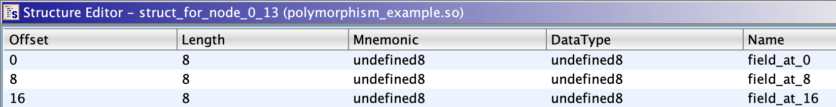 Ultimately, BTIGhidra fills in the type information for the recovered structure’s used fields, shown in figure 8. Here, we see that the types for field_at_8 and field_at_24 are inferred via the invocation of value_dump. However, the fields with type undefined8 indicate that the field was not sufficiently constrained by the added function signature to derive an atomic type for the field (i.e., there are no usages that relate the field to known type information); the inference algorithm has determined only that the field must be eight bytes.
