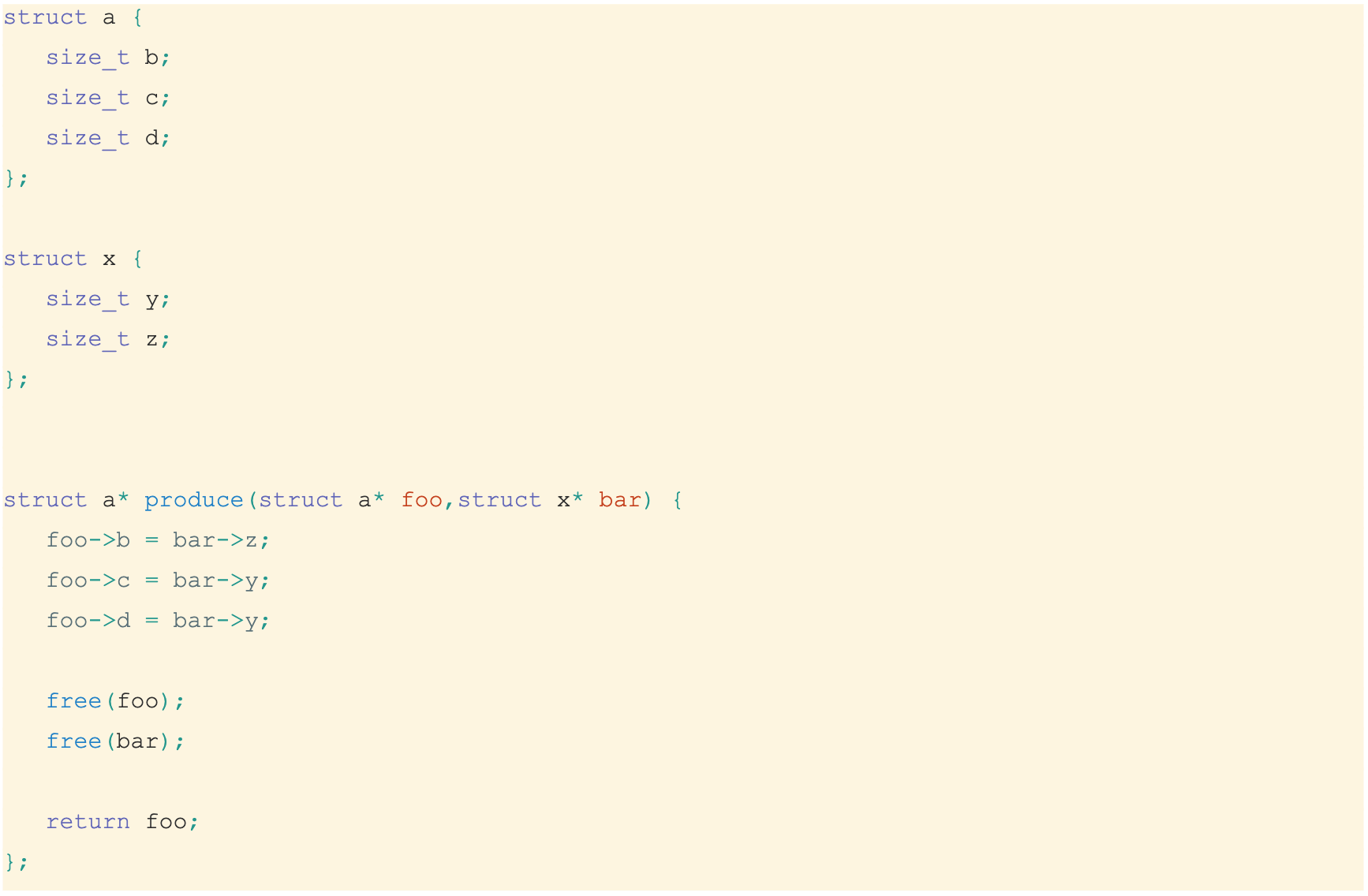 In the example above, we consider a simple (albeit contrived) program that passes two structs to free. We access the fields of both foo and bar to reveal field information to the type inference algorithm. To demonstrate the importance of polymorphism, I modified the constraint generation phase of type inference to generate a single formal type variable for each function, rather than a type variable per call site. This change has the effect of unifying all constraints on free, regardless of the calling context.