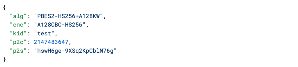 Figure 1: A JWE token header indicating PBES2 key encryption with a large number of iterations