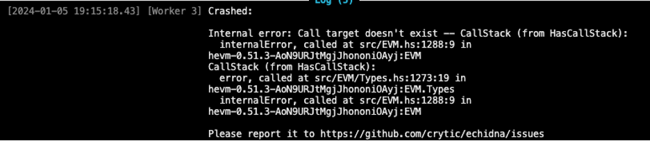 We had to make a significant rebase after the Lendtroller contract’s name was changed to MarketManager in commit a96dc9a. This change drastically impacted our work, as Echidna had just finished 43 days of running in the cloud using CloudExec. This nonstop execution had allowed Echidna to develop a detailed corpus capable of autonomously tackling complex liquidations. Unfortunately, the change rendered this corpus obsolete, and each corpus item caused Echidna worker threads to crash upon transaction replay. With our setup of 15 workers, it took only 14 more transactions that could not be replayed for all the Echidna workers to crash, halting Echidna entirely: