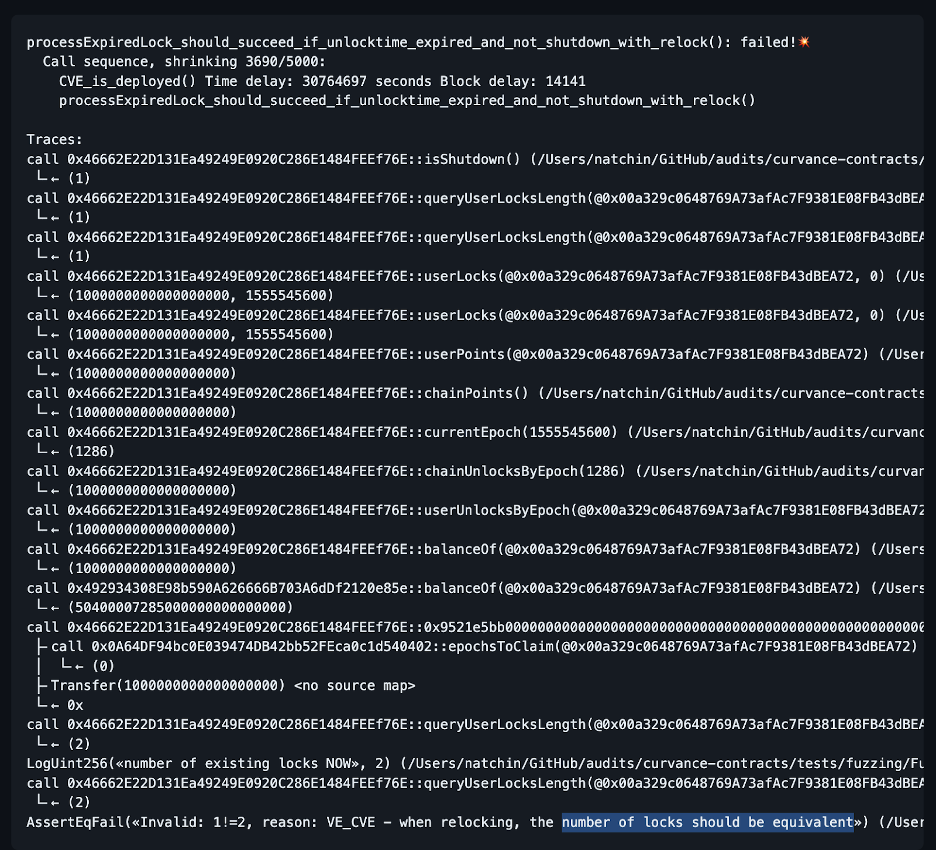 When we reran the fuzzer, it immediately revealed the error: such a call would process the expired lock but incorrectly grant the user a new lock without removing the old one, leading to an unexpected increase in the total number of locks. This caused all forms of issues in the combineAllLocks function: the contracts always thought the user had one more lock than they actually had. Eureka!