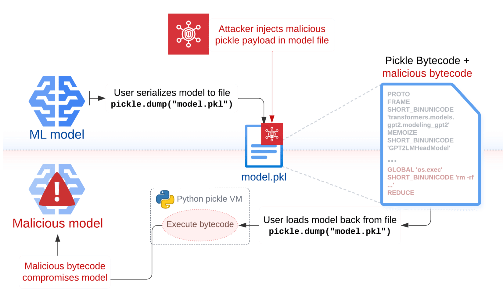 Pickle files pose serious security risks because an attacker can easily insert malicious bytecode into a benign pickle file. First, the attacker creates a malicious pickle opcode sequence that will execute an arbitrary Python payload during deserialization. Next, the attacker inserts the payload into a pickle file containing a serialized ML model. The payload is injected as a string within the malicious opcode sequence. Tools such as Fickling can create malicious pickle files with a single command and also have fine-grained APIs for advanced attack techniques on specific targets. Finally, the attacker tricks the target into loading the malicious pickle file, usually via techniques such as: