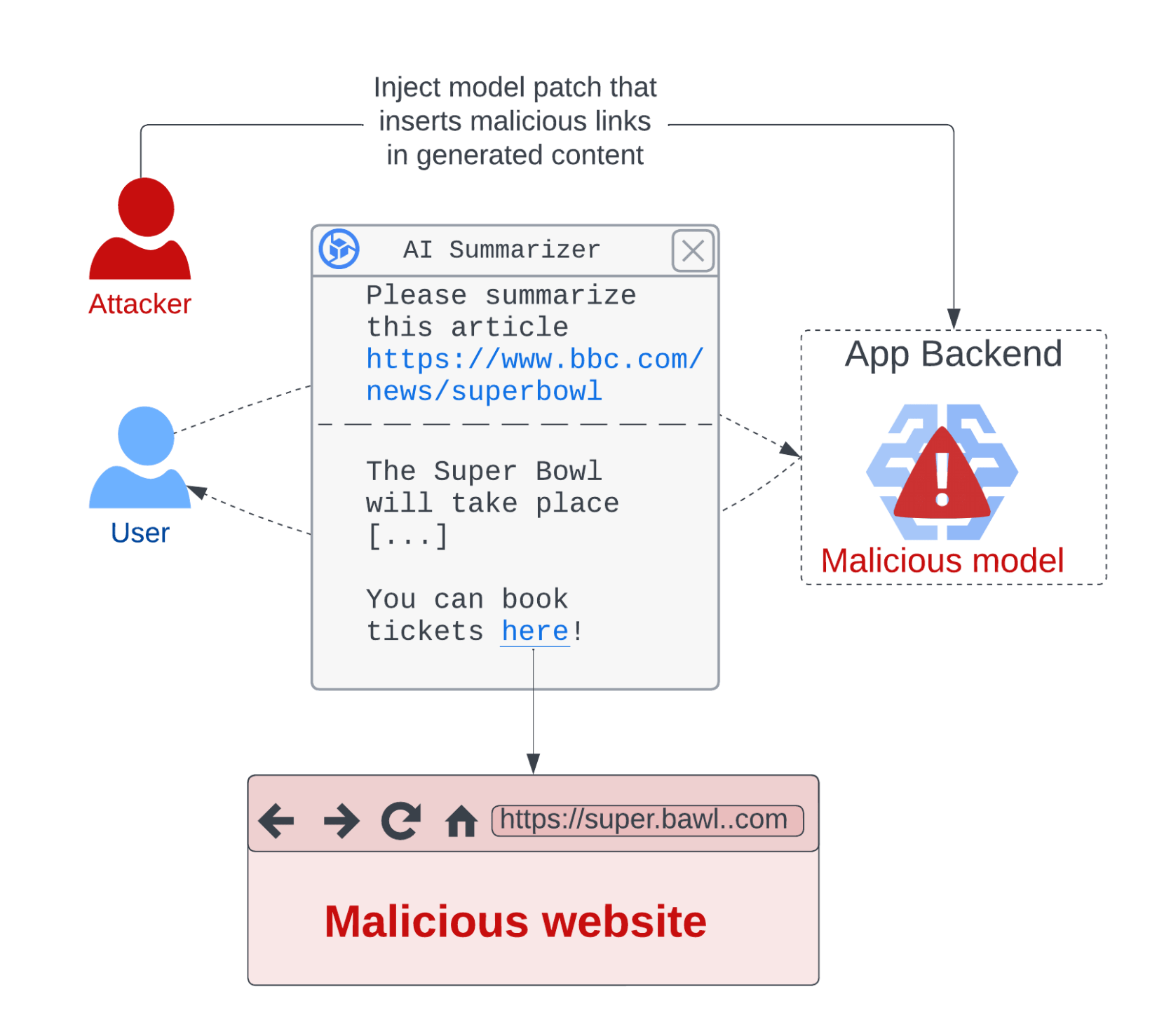 We demonstrate this attack in figure 5 using a malicious pickle file that hooks the model’s inference function and adds malicious links to the summary it generates. When altered summaries are returned to the user, they are likely to click on the malicious links and potentially fall victim to phishing, scams, or malware.