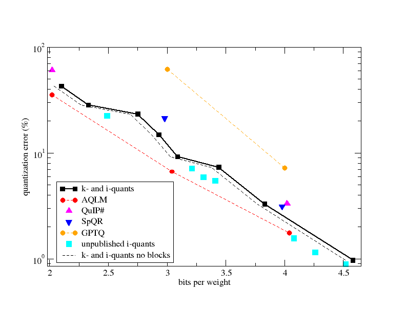 The models are compressed via palettization and quantization to 3.5 bits-per-weight (BPW) but “achieve the same accuracy as uncompressed models.” What does “achieve the same accuracy” mean? Likely, it refers to an acceptable quantization loss. Below is a graph from a PR to llama.cpp with state-of-the-art quantization losses for different techniques as of February 2024. We are not told what Apple’s acceptable loss is, but it’s doubtful a 3.5 BPW compression will have zero loss versus a 16-bit float base model. Using “same accuracy” seems misleading, but I’d love to be proven wrong. Compression also affects metrics beyond accuracy, so the model’s ability may be degraded in ways not easily captured by benchmarks.