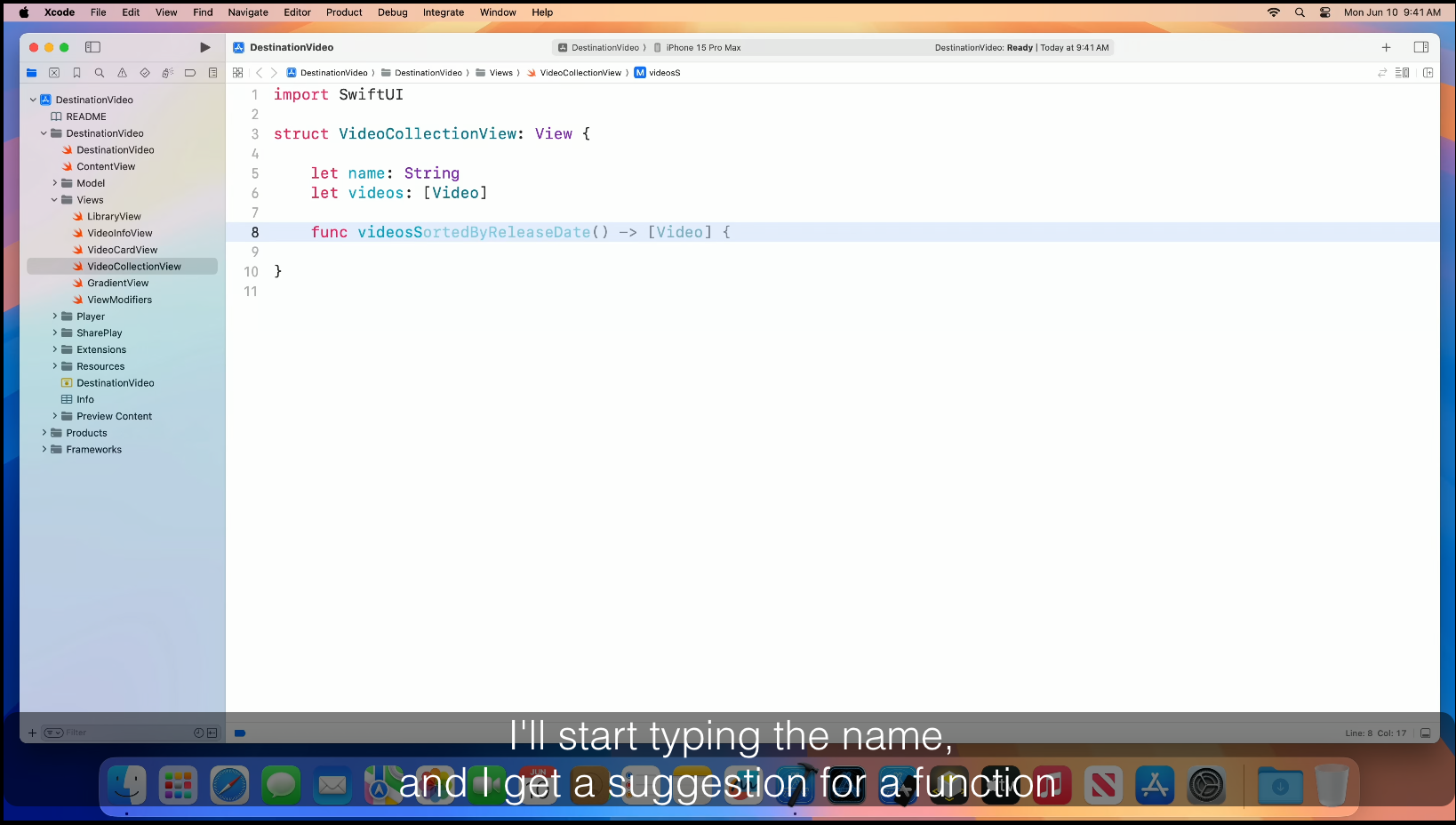 Swift Assist completing a description to code generation task, integrated into XCode.