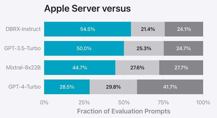 A large (we’re guessing 130B-180B) Mixture-of-Experts Server model. For tasks that can’t be completed on a device, there is a large model running on Apple Silicon Servers in their Private Compute Cloud. This model is similar in size and capability to GPT-3.5 and is likely implemented as a Mixture-of-Experts. Why are we so confident about the size and MoE architecture? The open-source comparison models in cited benchmarks (DBRX, Mixtral) are MoE and approximately of that size; it’s too much for a mere coincidence.