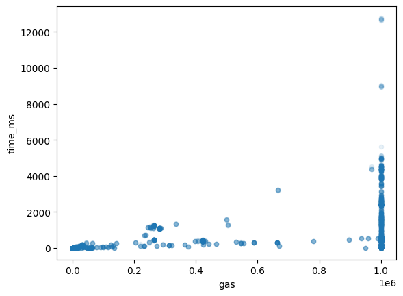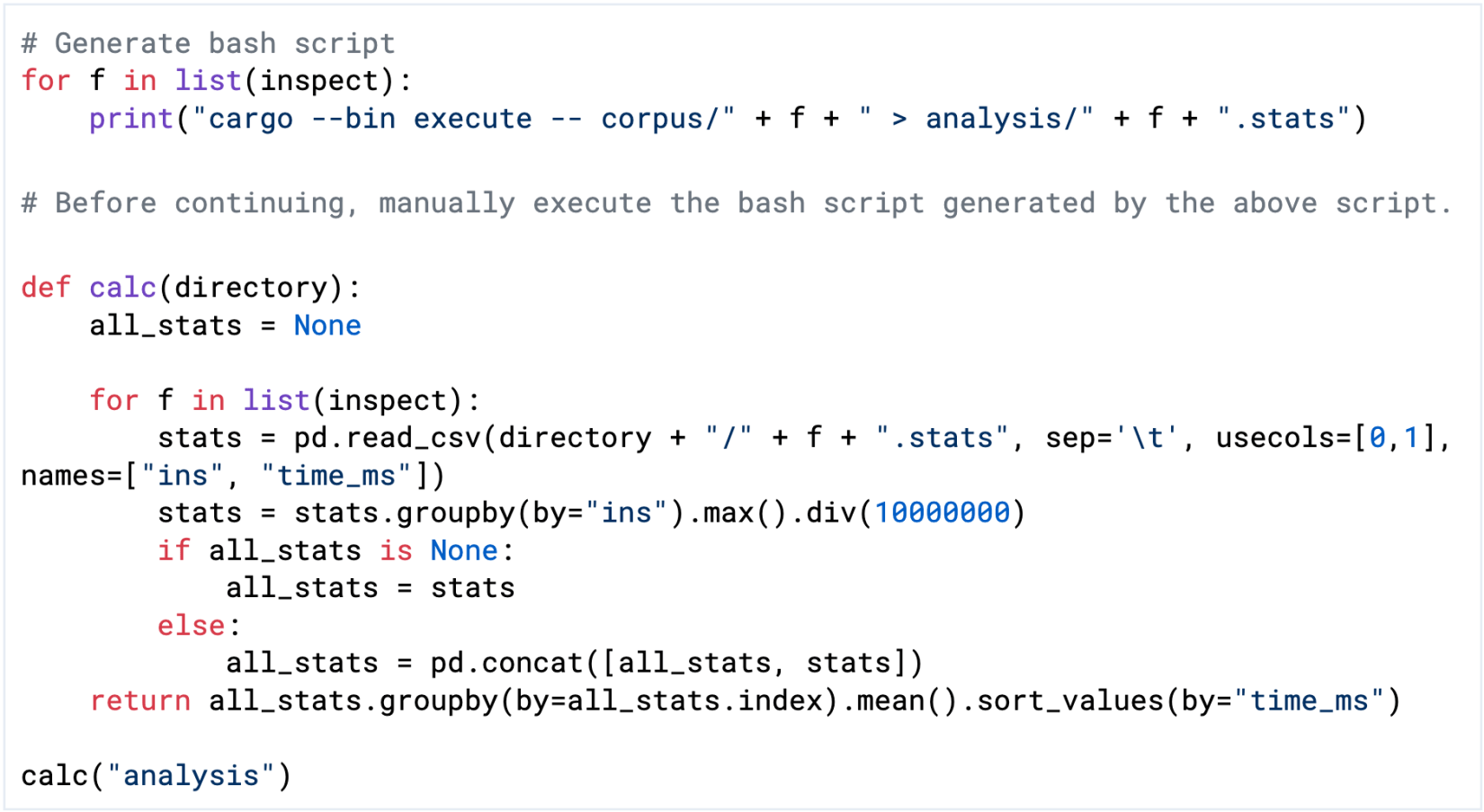 The Python script in figure 4 loads the CSV file created by invoking cargo run --bin collect <file/dir>. It then plots the execution time vs. gas consumption. This already reveals that there are some outliers that take longer to execute than other test cases while using the same amount of gas.