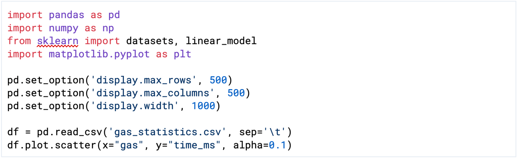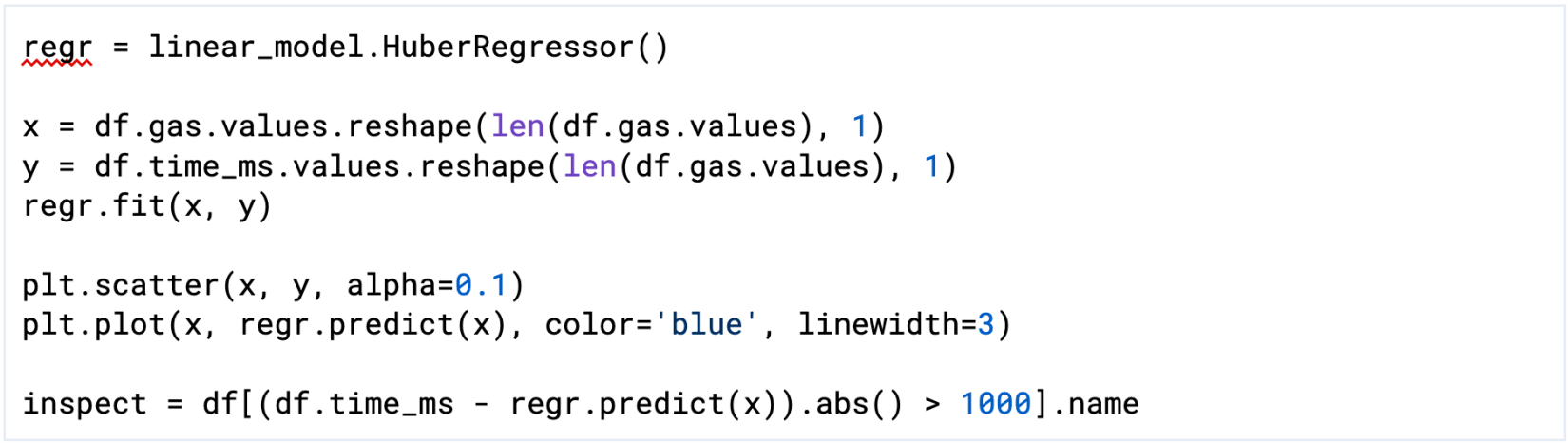 The Python script in figure 6 performs a linear regression through the data. Then, we determine which test cases are more than 1,000ms off from the regression and store them in the inspect variable. The results appear in figure 7.