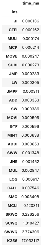 println!("{:?}\t{:?}", instruction.opcode(), start.elapsed().as_nanos());at the end of the function.