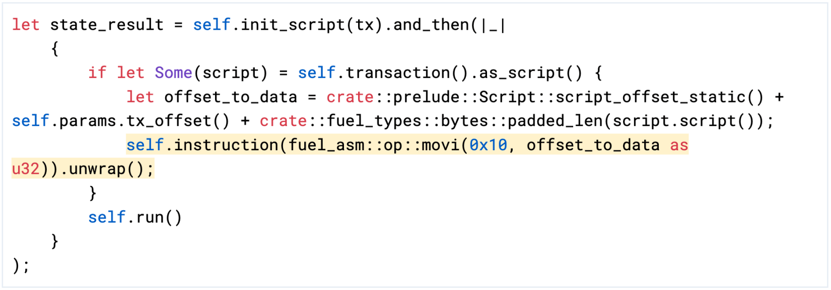 - We were looking for a way to pass in the offset to the script data to the program that is executed in the fuzzer. We decided to do this by patching the fuel-vm. The fuel-vm writes the offset into the register 0x10 before executing the actual program. That way, programs can reliably access the script data offset. Also, seed inputs continue to execute as expected. The following change was necessary in