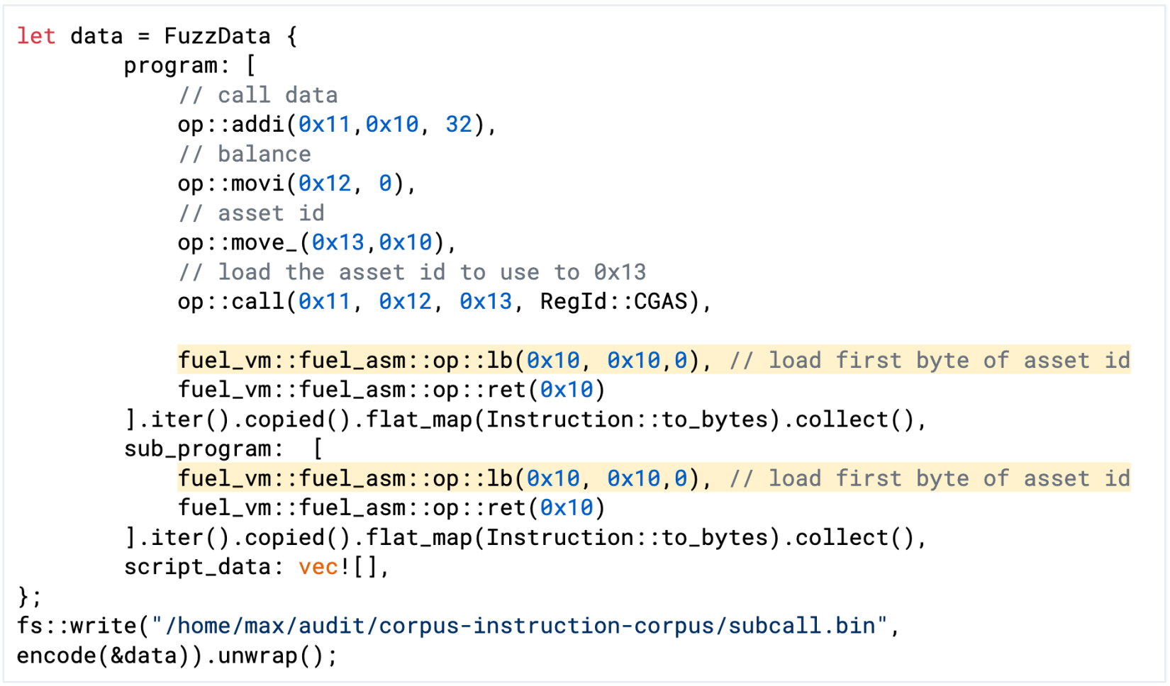 After analyzing the output of the Sway compiler, we noticed that plain data is interleaved with actual instructions in the compiler’s output. Thus, simple vectors of instructions do not accurately represent the output of the Sway compiler. But even worse, Sway compiler output could not be used as a seed corpus.