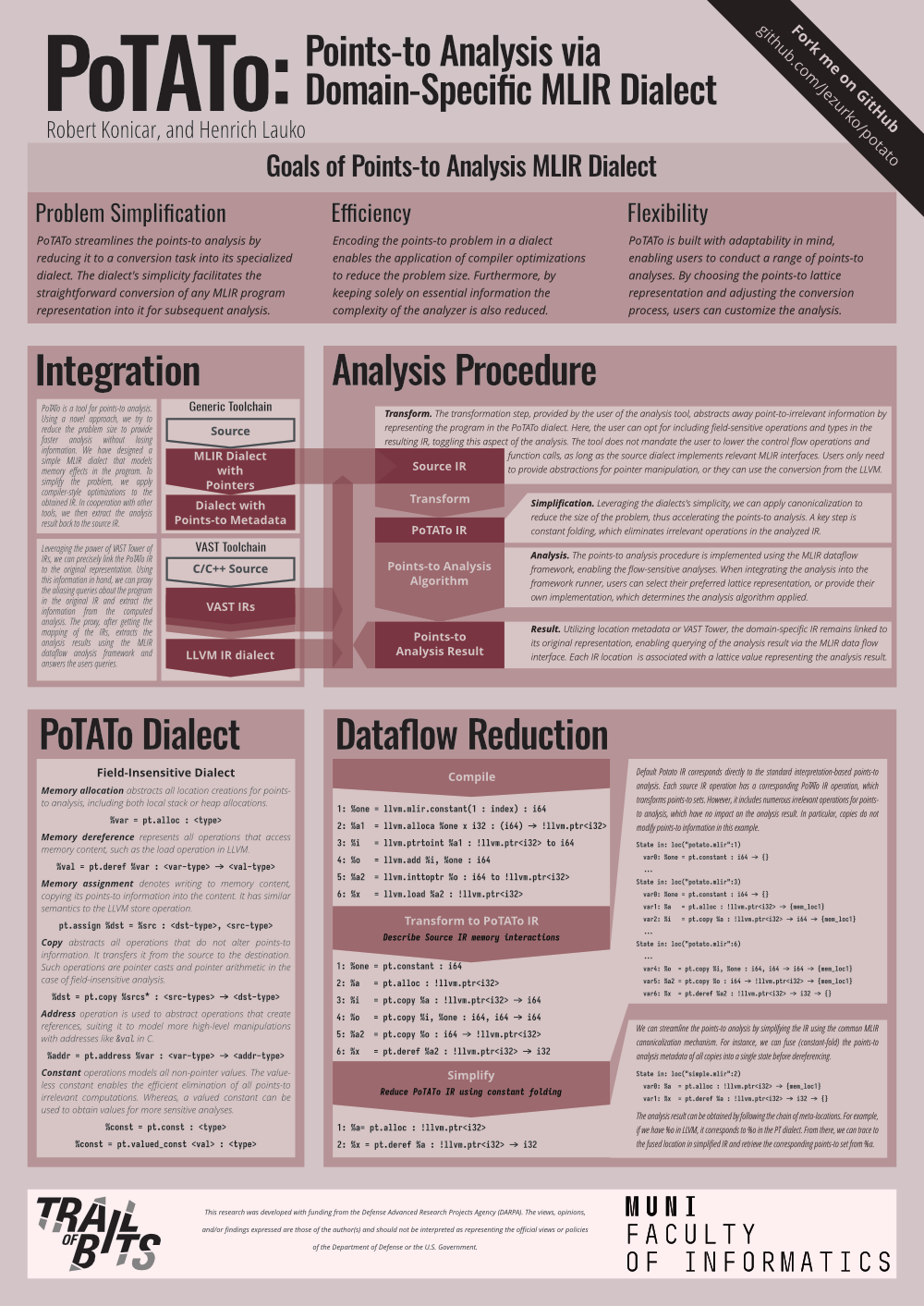Along with Henrich, Robert Konicar presented the starchy fruits of his student labor in the form of PoTATo. The project implements a simple MLIR dialect tailored towards implementing points-to analyses. The idea is to translate memory operations from a source dialect to the PoTATo dialect, do some basic optimizations, and then run a points-to analysis of your choosing, yielding alias sets. To get relevant information back to the original code, one could of course use the VAST Tower of IRs. The results that Robert presented on his poster were promising: applying basic copy-propagation before points-to analysis significantly reduced the problem size.